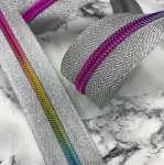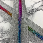 Tape is a silver metallic with rainbow colored teeth. Perfect for any bag that needs extra sparkle!